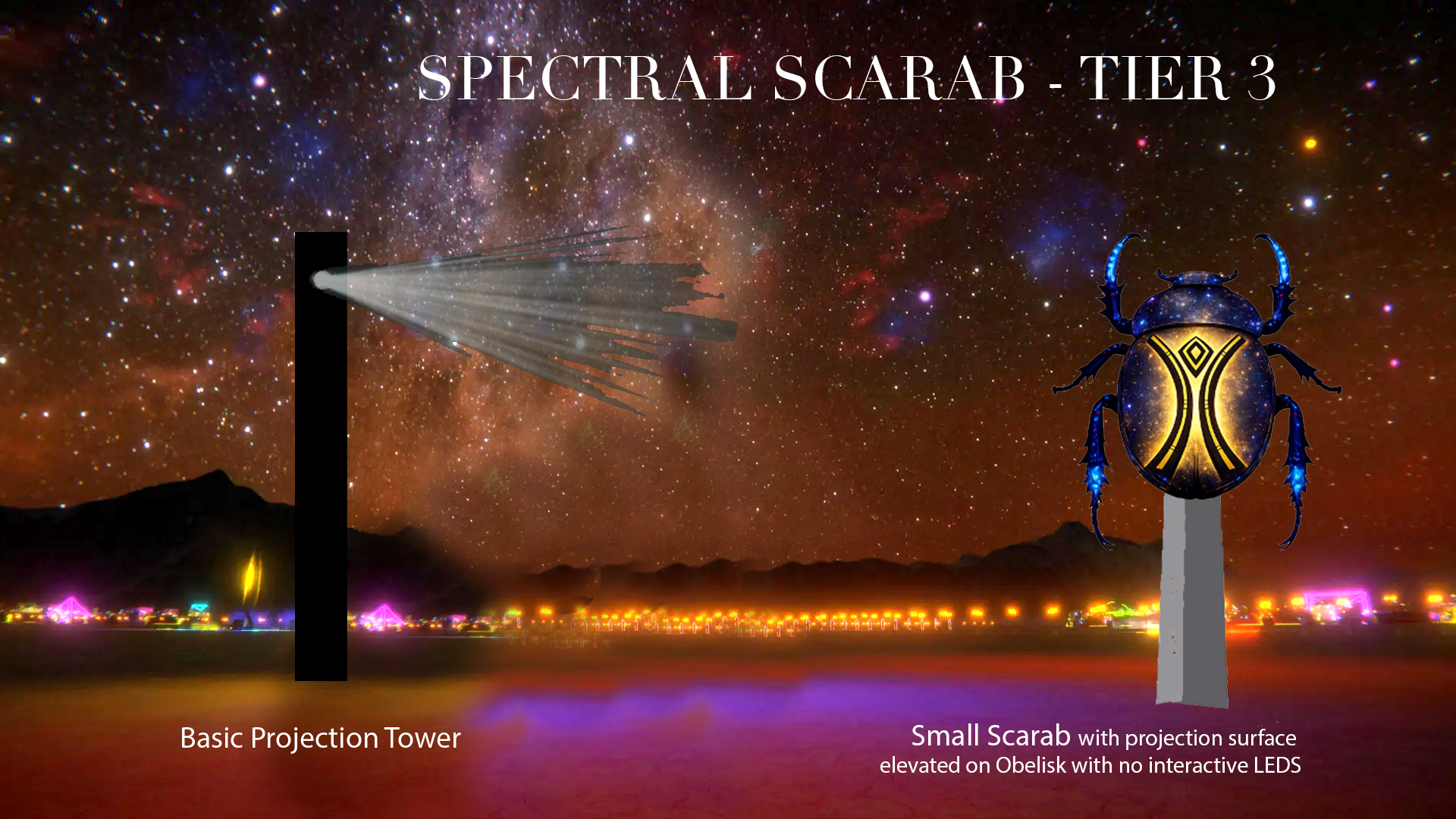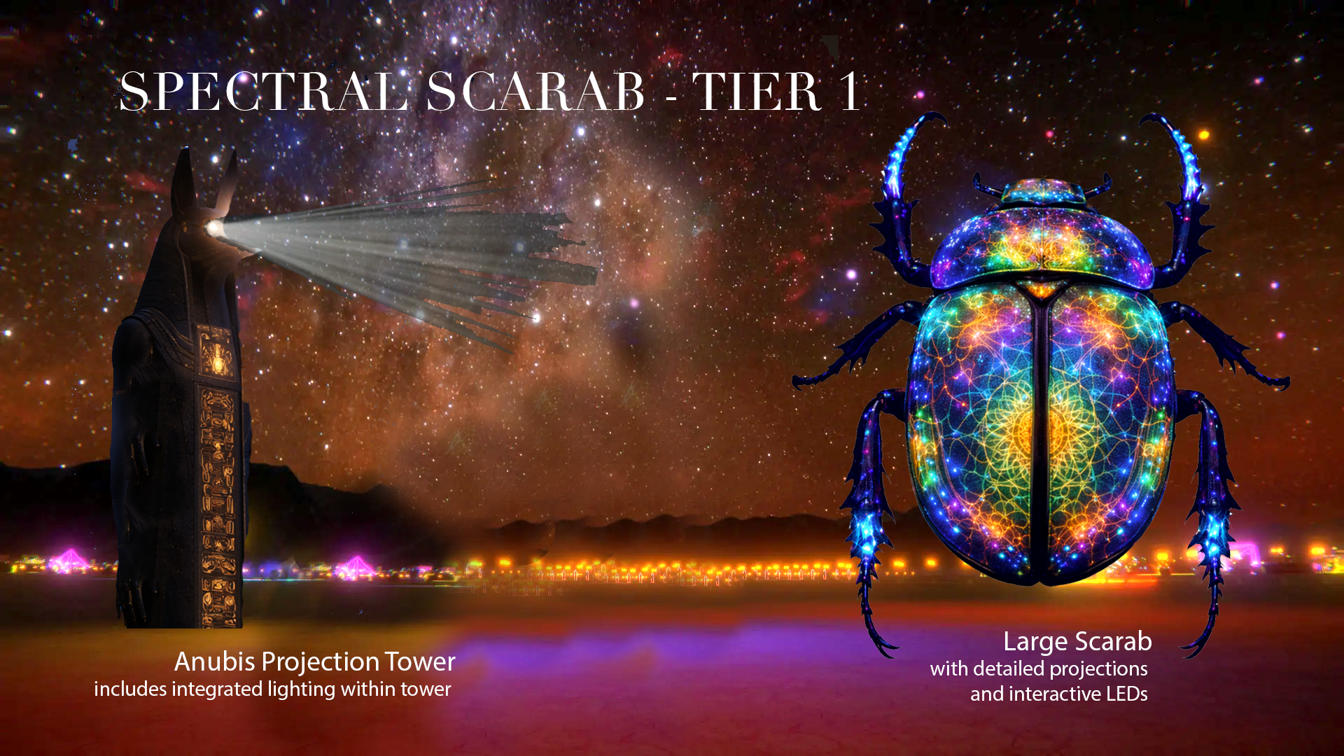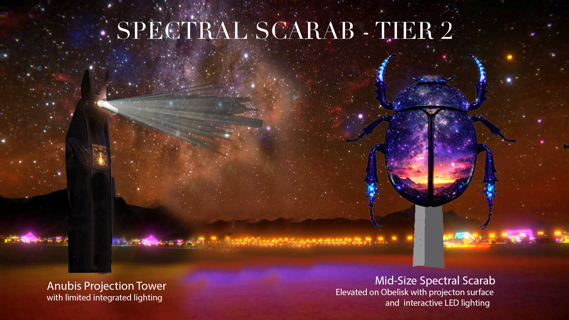By uniting myth with playa transitions, Spectral Scarab becomes a modern Axis Mundi—a threshold where day, night, body, and spirit converge. It offers a space to let something die, greet what is reborn, and recognize the transformational power held within each cycle of light.